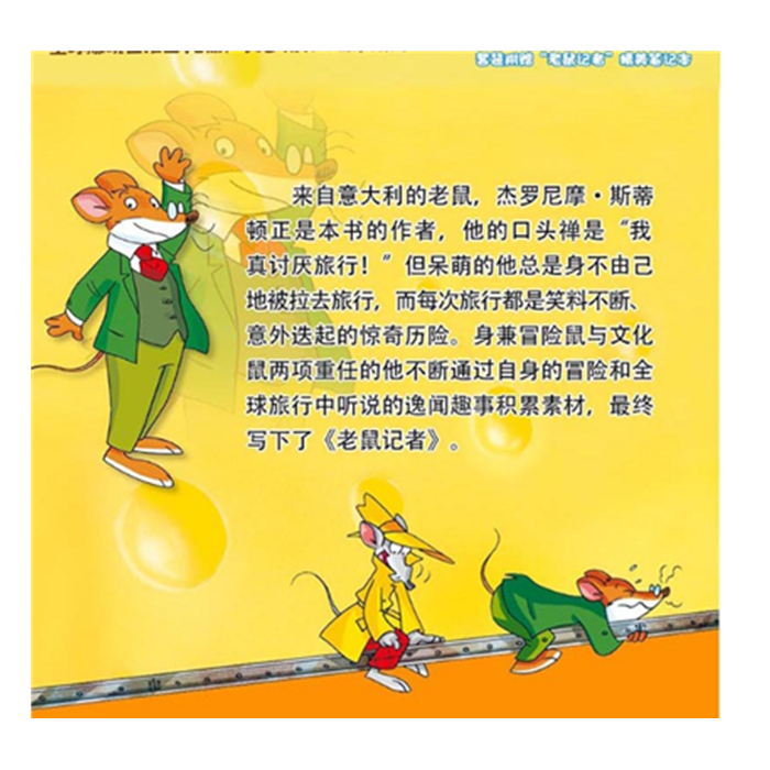 本套图书主要针对7-8岁的读者,借用妙鼠城的记者——一个名为杰罗尼摩·斯蒂顿的老鼠的视角,讲述了一个又一个充满幽默色彩的探秘冒险故事,展现了一个奇趣无边的老鼠世界。