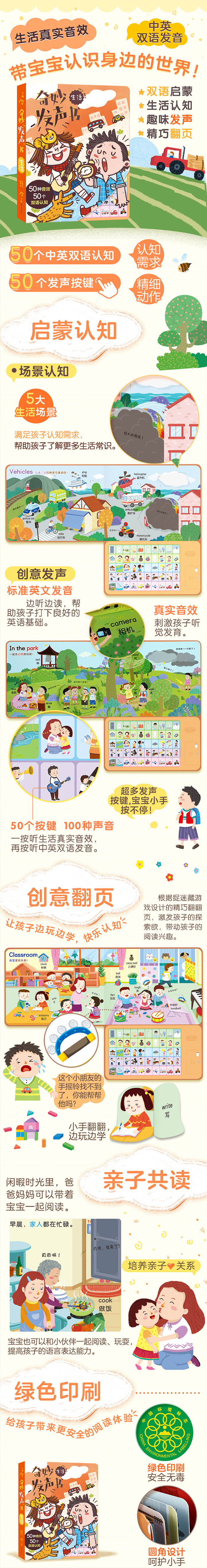 这是一套针对0~3岁低幼儿童的认知发声书,通过各种声音,让孩子认知生活中常见的各种认知物。全套共两本,分别认知生活中的认知物和动物。《生活》是本套丛书的第一册,主要介绍的是生活中的各种认知物,包括家庭中、学校里、大街上等各种场景,还会认知天气、乐器等各种常见的认知物。通过各种带有特色的声音,让孩子在家就能认知各种认知物。