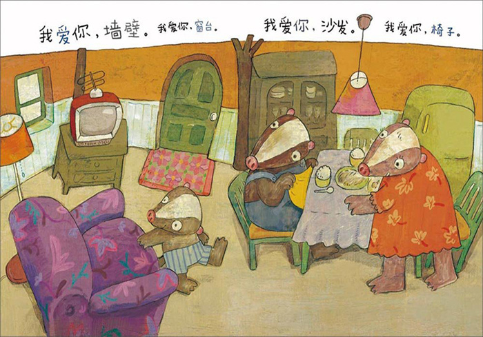 故事中调皮、可爱的小獾从幼儿园里学会了说“我爱你”,从此它像一个爱的小精灵,絮絮叨叨地不断重复着我爱你……我爱你……认真地对着身边每一样事物表达着他的爱,无论对方是人还是物,是否给予他同样的回应,给这个世界传递和创造出更多温馨的“爱”和感动。。在孩子天真的世界里,就是这样不需要回报,当不期于回报时,一切都真实得可爱。