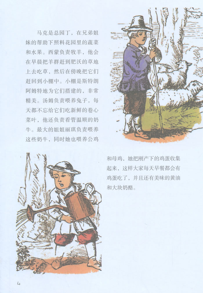 马克是总园丁,在兄弟姐妹的帮助下照料花园里的蔬菜和水果。西蒙负 责牧羊,他会在早晨把羊群赶到肥沃的草地上去吃草,然后在傍晚把它们赶 回到小棚中。小棚是斯特朗阿姆特地为它们搭建的,非常精美。汤姆负责喂 养兔子,每天都不忘给它们吃新鲜的卷心菜叶,他还负责看管温顺的奶牛。