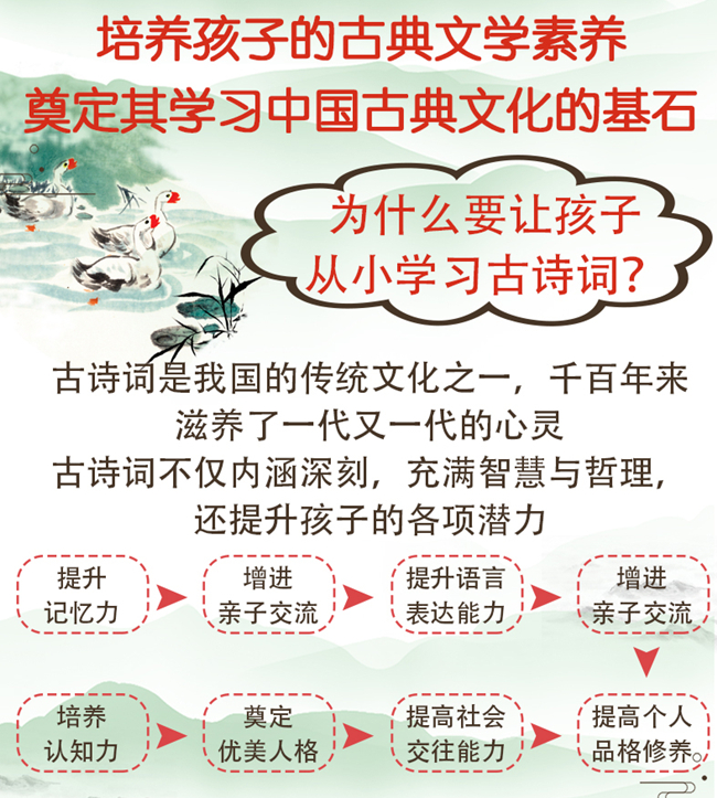 中华文化源远流长,中国古典诗词是千年沉淀的精华,是一个民族的灵魂所载,它有着“随风潜入夜,润物细无声”的神妙作用。孔子说:“不学诗,无以言。”在孩子记忆力最好的时期让他们接触最具经典和价值的作品,是奠定一生语言文字功底和思维能力的最好方式。丛书针对儿童,精选了中国古典诗词中脍炙人口、耳熟能详的名句,配以精美手绘插图,为小读者再现诗词的精华,让孩子在快乐阅读的同时感受到古诗词的魅力,吸取传统文化中的精华,进而热爱古诗词,热爱中华古典文化。《给孩子读的古诗词·儒雅翩翩》选取的是与个人修养有关的名诗篇目。