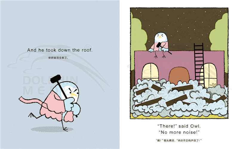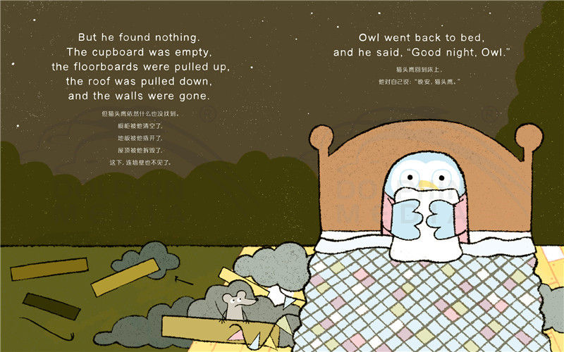猫头鹰准备睡觉了,他对自己说:“晚安,猫头鹰(good night,owl)!”但每次他刚刚闭上眼睛,就听到房间里奇怪的叫声:squeek!猫头鹰睁开眼睛,在房间里找那个声音的来源。猫头鹰把橱柜、书架、地板统统都翻了个遍,他能找出那个奇怪的声音,然后安心睡觉吗?……猫头鹰将永远不会睡觉,除非他能搞清楚这是怎么回事!也许,一句温柔的由此及彼的“晚安”是让大家都能享受安稳夜晚的魔法……