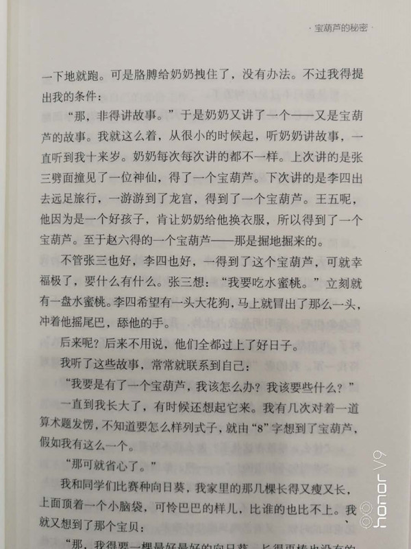 “那,非得讲故事。”于是奶奶又讲了一个——又是宝葫芦的故事。我就这么着,从很小的时候起,听奶奶讲故事,一直听到我十来岁。奶奶每次每次讲的都不一样。上次讲的是张三劈面撞见了一位神仙,得了一个宝葫芦。下次讲的是李四出去远足旅行,一游游到了龙宫,得到了一个宝葫芦。王五呢,他因为是一个好孩子,肯让奶奶给他换衣服,所以得到了一个宝葫芦。至于赵六得的一个宝葫芦——那是掘地掘来的。