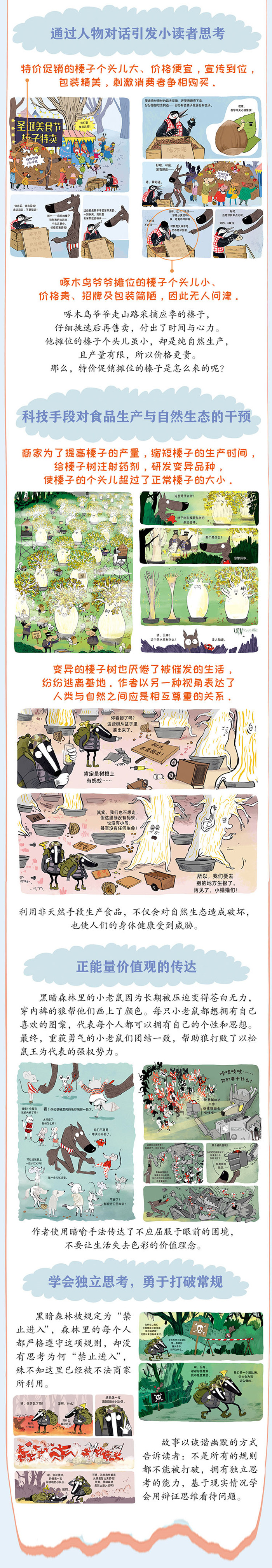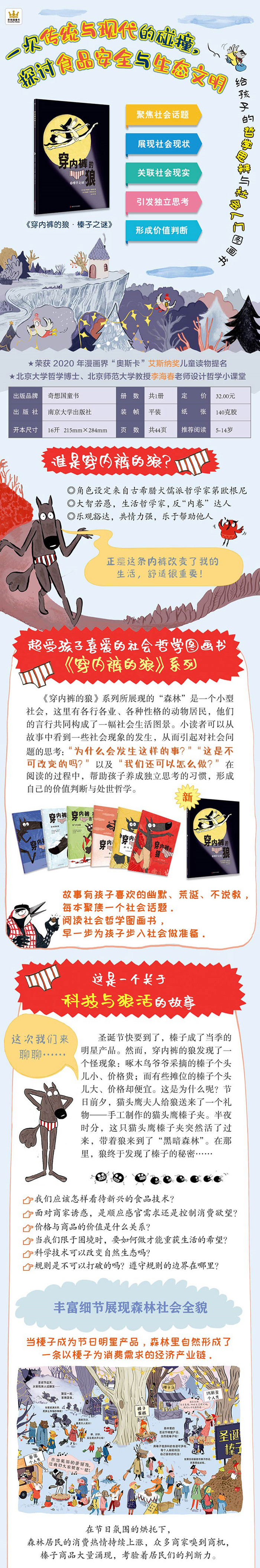 ★幽默爆笑社会哲学,给孩子的哲学思辨与社会入门图画书,《穿内裤的狼》系列新作第六册。 ★内裤 案件,幽默 悬疑,故事有孩子超爱的荒诞搞笑和不说教。 ★以森林喻社会,聚焦社会话题,展现社会现状,关联社会现实。 ★一场拨开重重迷雾,勇于发掘榛子生产真相的冒险,引发读者多角度思考: 1.我们应该怎样看待新兴的食品技术? 2.面对商家诱惑,是顺应感官需求还是控制消费欲望? 3.价格与商品的价值是什么关系? 4.当我们限于困境时,要如何做才能重获生活的希望? 5.怎样看待人类与自然的关系?科学技术可以改变自然生态吗? 6.规则是不可以打破的吗?遵守规则的边界在哪里? ★丰富的图画细节展现森林社会全貌,巧妙的故事情节传达正能量价值观。 ★帮助孩子养成独立思考的能力,学会用辩证思维分析问题,形成自己的价值判断与处世哲学。