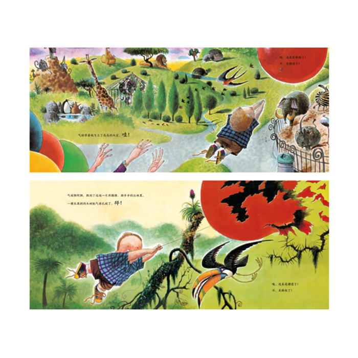 动物园里,一个小男孩被父母买给他的红色大气球带着飞向了天空。噢,这棒极了!噢,不,这糟透了,气球带他越飞越远,飞向了树林。气球被树枝划破了,小男孩掉下来了,正好掉进河马的水池里。他爬到河马的身上,河马带他游到岸边。噢,这棒极了,不,这糟透了,岸边的密林里躲着一群狒狒,他们追着他不放,让小男孩跑得快断气。这糟透了,不,是棒极了!小男孩和狒狒一起用树藤荡秋千,可好玩啦!小男孩抓住一根树藤,用力一荡,从狒狒的爪子下逃走了。嘿!这棒极了!不,是糟透了,小男孩手里的树藤原来是一根又长又粗的蛇,它可真吓人!噢,这真是糟透了!不,是棒极了!小男孩松开手,哎哟!正好落在一只长颈鹿的背上,呀!噢,这真是棒极了!不,是糟透了!长颈鹿低下头,去喝沼泽里的水,咕咚,咕咚!小男孩从长颈鹿的脖子上滑下来,掉进了一头大象脚下的泥沙里,噗!经过一系列棒极了、糟透了的奇遇后,天黑了,小男孩害怕地哭起来了,这时候好心的鹳鸟带着小男孩飞起来,把他送回了爸爸妈妈的怀里。