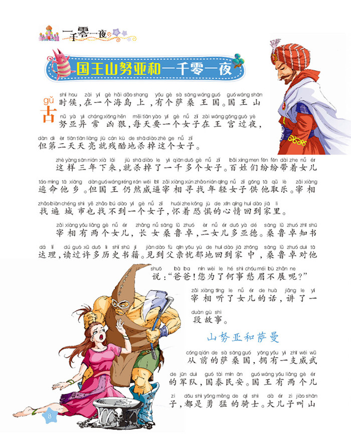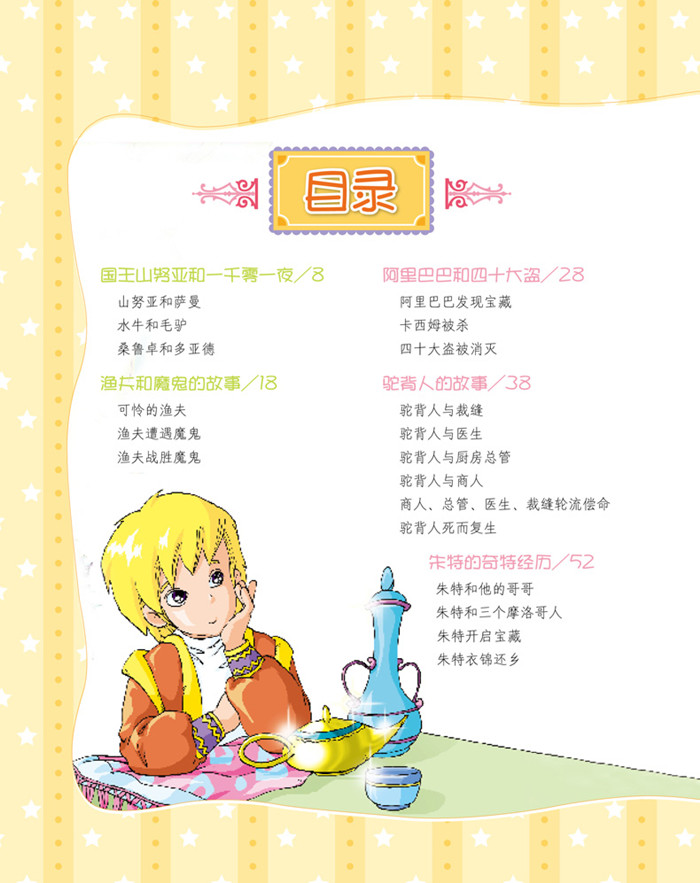 这本《一千零一夜》选择了耳熟能详的童话故事,比如《阿里巴巴和四十大盗》、《渔夫和魔鬼的故事》、《阿拉丁神灯》和《辛巴达历险记》等,还有特别有趣的《驼背人的故事》、《撒谎者贝浩图》的故事等,长短交叉,长故事又分成若干个小节,使故事更适合小朋友阅读。本书文字简练生动,每篇都配以精心绘制的插图,带给孩子生动体验。