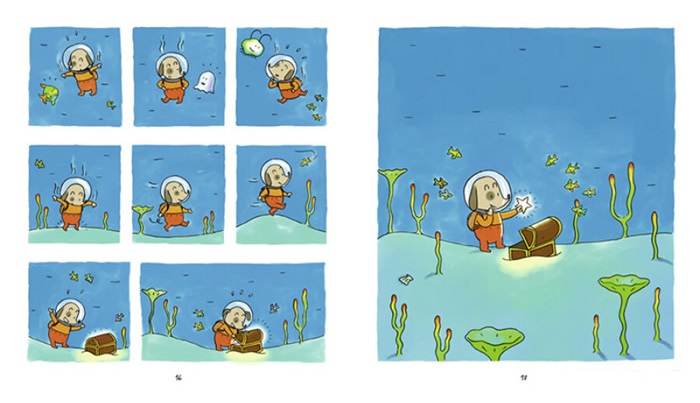 本着让尚未识字的儿童独立阅读的初衷,法国人雷吉斯·法勒创作了这套享誉全球的《小狗保罗》。相比佶屈聱牙的文字符号,图画对孩子有着一种天然的亲和力。孩子能自觉调动已有的生活经验、阅读经验,对图画内容和故事情节进行诠释,使其符合自己的经验和情感。没有了文字,“导演”法勒让图画责无旁贷地承担了叙述的职能,娴熟的图画叙事能力、深厚的分镜功底、不拘一格的想象力,让画面产生如戏剧换幕般的连续性效果,把小狗保罗的故事讲述得流畅动人,让小读者们也想和保罗一样背上背包,踏上奇幻之旅。