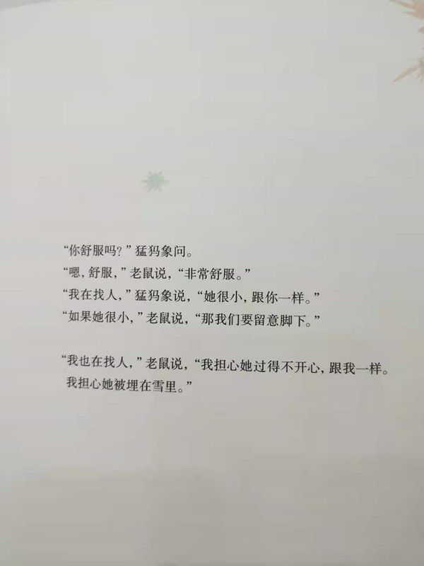 这是一本关于孤独和友情的图画书。一只渴望获得友谊的猛犸象在大地上孤独地徘徊,他帮助了一只小鸟,小鸟要为自己的朋友小老鼠带去几朵黄色的蒲公英。小鸟飞走了,猛犸象很失落。不久,暴风雪来了,猛犸象担心小鸟会遇到危险,他要去看看小鸟怎么样了。途中,他救起一只小老鼠,他们一起找到小鸟,救起了他。他们三个成了好朋友。