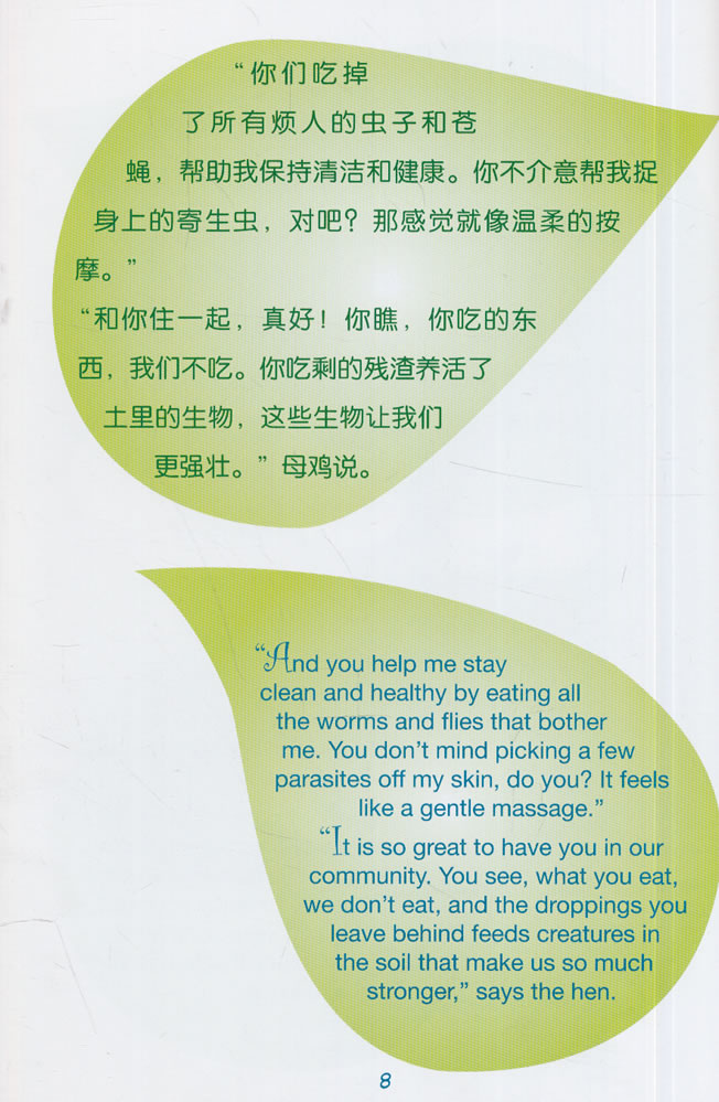 《冈特生态童书》是一套以环保为主题、面向5-10岁儿童的科普知识绘本。在书中,作者以当前地球生态面临的诸多现实问题为蓝本,设计出了一个个让孩子们好奇的话题,并将这些有趣的故事用一幅幅生动的卡通画形式进行呈现。在本书中,小猪对自己身边的每一个人都怀有深深的同情心,关心他人的幸福。即使存在禽流感的威胁,他还是希望和鸡住在一起。他意识到应对世界饥 饿问题需要更多食物,那就需要多元化生态系统。为了产量,杀害公鸡或母鸡,他认为这不合理,并非常同情他们,愿意给所有不被接受的小鸡提供住所,甚至欢迎两倍数量的鸡(公鸡和母鸡)来这里。母鸡对小猪给予她的关心很高兴。她坦率地讨论起伤心的话题,说出了自己对其他鸡的担忧,他们没有机会像她一样感受生活。母鸡明确地回答了小猪的问题和疑虑,揭开了问题背后的真实原因。当小猪说欢迎其他人来这片富足的土地上时,母鸡感到兴奋。