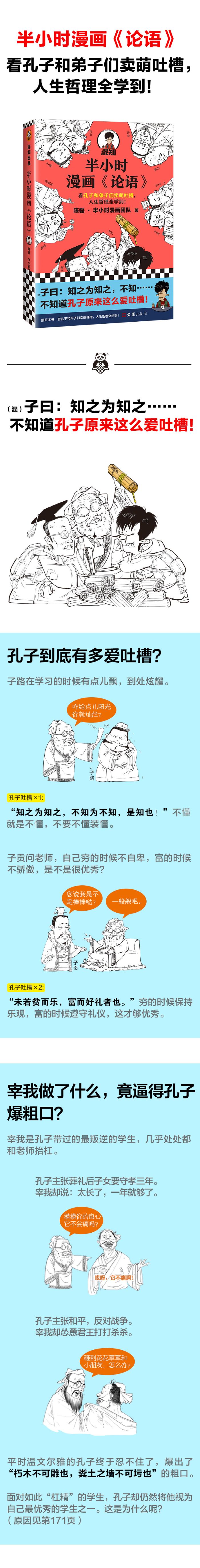 孔子原来这么爱吐槽!作者用漫画和段子的方式讲述孔子和弟子们的故事,一边展示他们的花式卖萌和吐槽,一边串讲《论语》里的经典章句,在哈哈大笑中学到《论语》里的人生哲理。 为什么颜回一生贫困潦倒,没做过什么大事,却获得了孔子“不迁怒,不贰过”的赞赏,并成为孔子最喜欢的学生? 我们耳熟能详的“知之为知之,不知为不知,是知也”,其实是孔子对子路学习态度不端的吐槽? 宰我到底做了什么,逼得孔子爆出了“朽木不可雕也,粪土之墙不可圬也”这样的粗口? 全书由《论语》研究专家审校,随书赠送人物闪卡和《<论语>必读章句手册》,句句都是人生哲理。 翻开本书,看孔子和弟子们卖萌吐槽,人生哲理全学到!