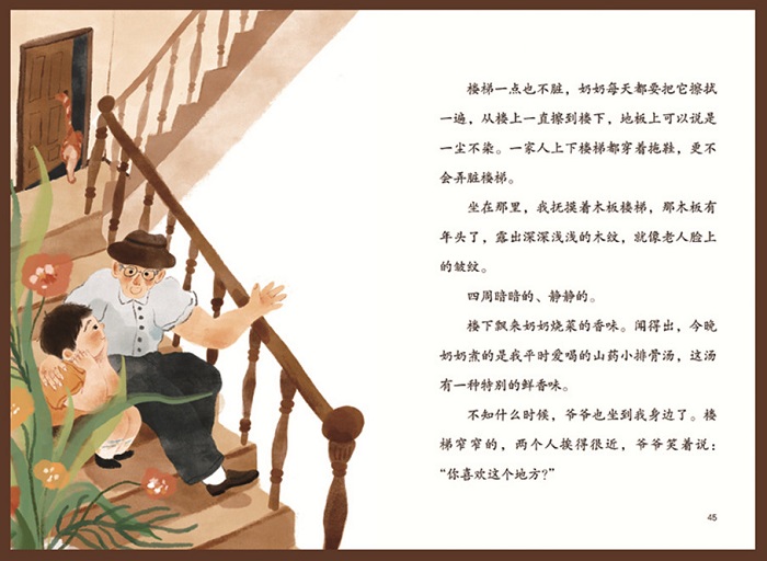 这本书是作家张秋生新近创作的一部儿童小说,以其童年生活的老房子为背景,字里行间洋溢着老弄堂淳朴、浓郁的生活气息。小说沿着两条叙事线索铺展开来,一条线索是祖孙两人重返弄堂的所见所闻,另一条线索是坐在老房子的楼梯口,爷爷给小孙子南南讲起一个他小时候的故事,故事中的故事有着童话的意味和色彩。人与人之间的温暖情意和记忆中的童年记事,让我们看到了老弄堂承载和传承的文化印记。