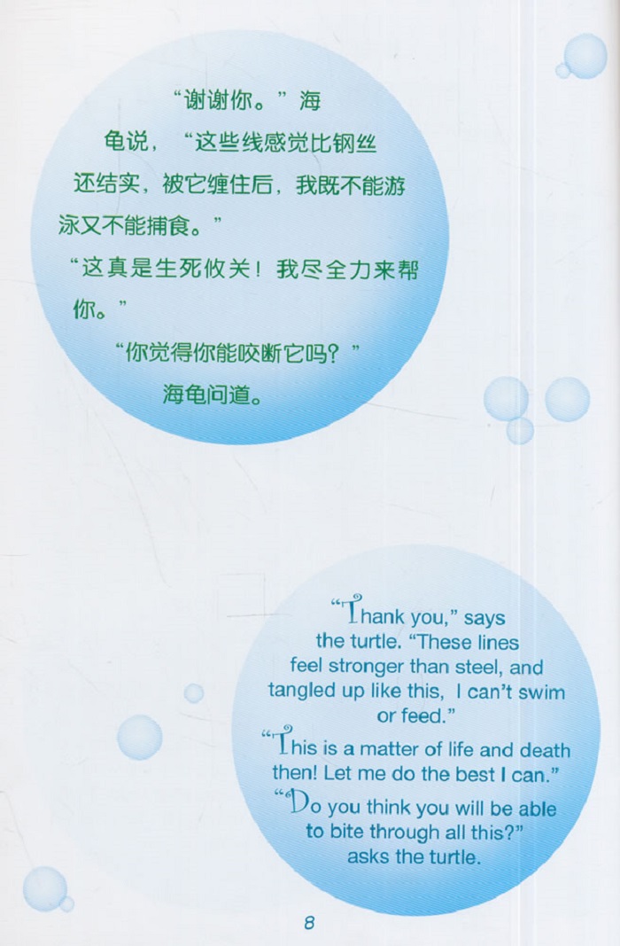 《冈特生态童书》是一套以环保为主题、面向5-10岁儿童的科普知识绘本。在书中,作者以当前地球生态面临的诸多现实问题为蓝本,设计出了一个个让孩子们好奇的话题,并将这些有趣的故事用一幅幅生动的卡通画形式进行呈现。本书由梭鱼爸爸解救海龟的故事展开讨论:梭鱼一家正在遭受病痛,但他们并不知道原因。尽管这样,梭鱼爸爸还是很关心别人,当他发现海龟行为异常时表现出了同情。海龟被渔线缠住了,处于生死存亡的紧急关头。梭鱼爸爸不知道渔线是什么,但是一旦意识到海龟面临生命危险,他立即准备用牙齿解救她。被解救出来后,海龟表达了谢意,然后询问塑料的味道,并且对人们不采用已知的方法来解决塑料污染问题感到不理解。海龟非常清楚人类所面临的挑战和抉择。她关注梭鱼一家的健康情况,并指出问题是因为误食塑料引起的。梭鱼爸爸不相信人类会欢迎那些真正有利的发明,因此他仍然想继续关注海洋所面临的问题,而不是去考虑陆地上人们所面临的抉择。当海龟提到塑料的替代品,如用蓟生产的生物塑料时,梭鱼爸爸发现这超出了他的理解。