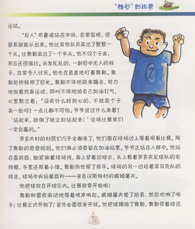 奥勒尽自己的一切力量,努力与“巨人”布鲁诺对抗。他一会飞快地奔跑,一会儿机灵而勇猛地带球过人,一会儿又奋力向球门冲去。奥勒踢得真是精彩极了!