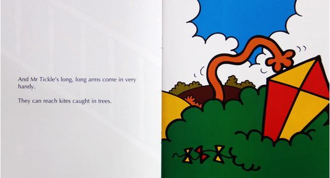 Mr. Tickle最喜欢做的事情莫过于用他长长的双臂骚人家痒。他长长的双臂可以穿过窗户、转过街角骚人家的痒。不只如此,他长长的双臂可是非常便利的,Mr. Tickle可以用它们把卡在树上的风筝给拿下来,还可以边洗澡边讲电话呢!但是,由于他的手臂过长,有时会带给Mr. Tickle一些些小麻烦,有时他的手臂会打结、不小心被人踩到、卷入饭店的旋转门里...,更惨的是当调皮捣蛋的Mr. Tickle遇到更加顽皮的Little Miss Naughty他长长的手臂可就变成Little Miss Naughty好玩的玩具啰!