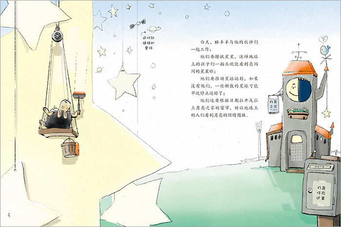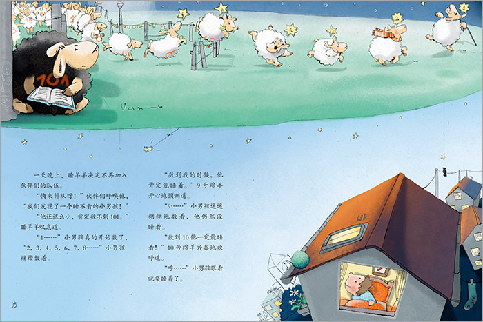 《数绵羊》:从前有一只可爱的“睡羊羊”,他和伙伴们一起,悠闲地生活在银河系的边缘。他们白天一起工作,擦拭星星、推动星球运转;到了晚上又一起排队等着睡觉的人们数绵羊。一,二,三……绵羊们按着编号的顺序跳来跳去,可“睡羊羊”的编号是101,从来没有人数到过他。这可怎么办!