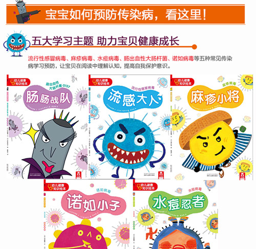 该系列针对五种常见病毒讲解了病毒的传播方式以及防治攻略,由免疫学、病毒学博士撰写,专家教您预防传染病毒,拟人化的讲解揭开病毒传染的秘密,绘本中流行性感冒病毒被拟人化作“流感大人”,麻疹病毒被拟人化作“麻疹小将”,诺如病毒被拟人化作“诺如小子”,水痘病毒被拟人化作“水痘忍者”,肠出血性大肠杆菌O157被拟人化作“肠肠战队”。拟人化讲解形象生动易于让孩子接受。
