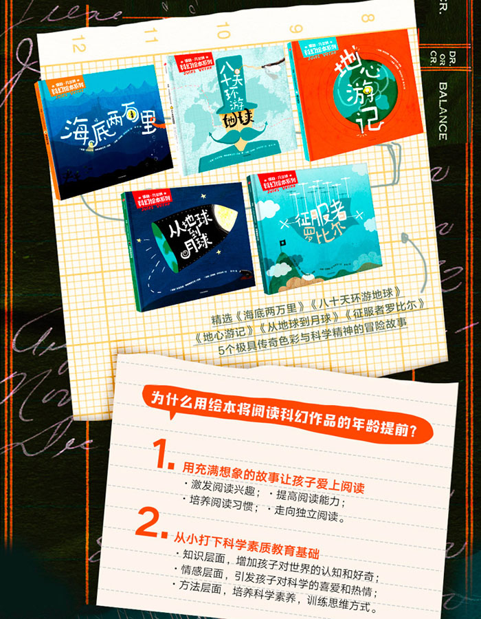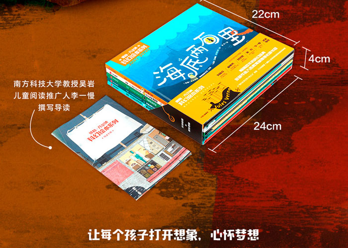 该系列包含《海底两万里》《八十天环游地球》《地心游记》《从地球到月球》《征服者罗比尔》5个极具传奇色彩与科学精神的冒险故事。原著故事由“现代科学幻想小说之父”儒勒·凡尔纳创作,这套绘本版则由两位国际大奖得主改编、绘图,他们将原著小说以绘本的形式再现,保留核心思想、降低阅读难度、突出儿童兴趣、绘制精美插画,使其符合3—8岁孩子阅读需求。