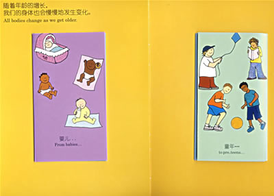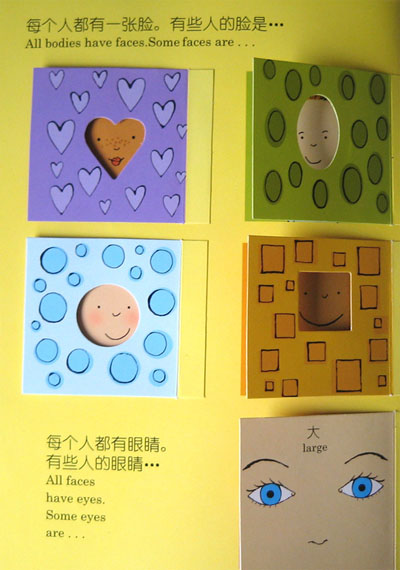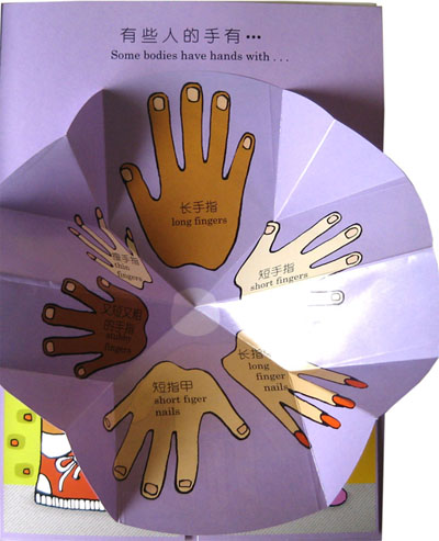 最吸引人的是这套书的“立体”性,每一页翻开都有各种立体的图案,或是可以移动的图案。随着书页的开合、手指的推拉、旋转,可以看到人、物的动作或是不同的内容,非常有趣。看书的过程充满了探索的乐趣,既鼓励了孩子们的阅读热情又可以让他们自己动手参与。 其次,这套书很好地为孩子们介绍了我们所生活的世界,既有建筑、汽车等与生活相关的物体,又有身体、人等与人有关的部分,还有感觉、害怕等这样的难以触摸的情绪。在书中,作者绘制了各个人种的孩子的形象,本书似乎很有“地球村”的感觉,让孩子可以在书中感受更广阔的世界。