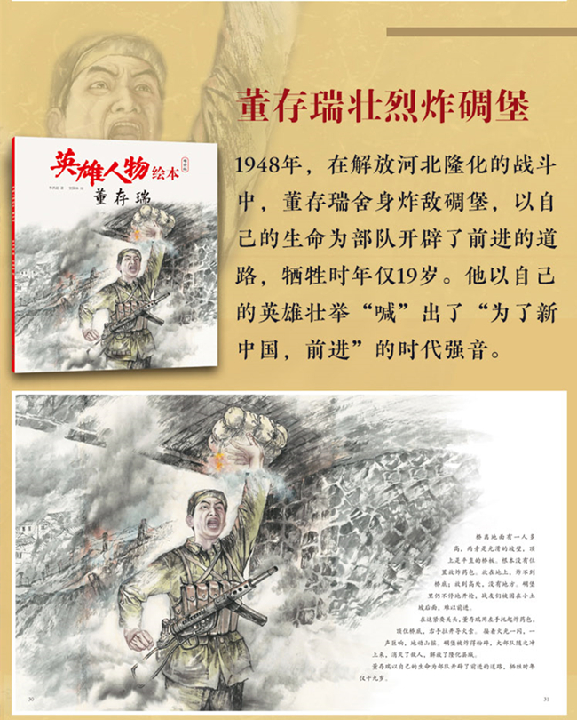 《英雄人物绘本·董存瑞》壮烈炸碉堡的战斗英雄董存瑞。1948年,在解放河北隆化的战斗中,解放军模范共产党员、全国战斗英雄董存瑞舍身炸敌碉堡,以自己的生命为部队开辟了前进的道路,牺牲时年仅19岁。他以自己的英雄壮举“喊”出了“为了新中国,前进”的时代强音。本书讲述的是董存瑞的生平和英雄事迹。
