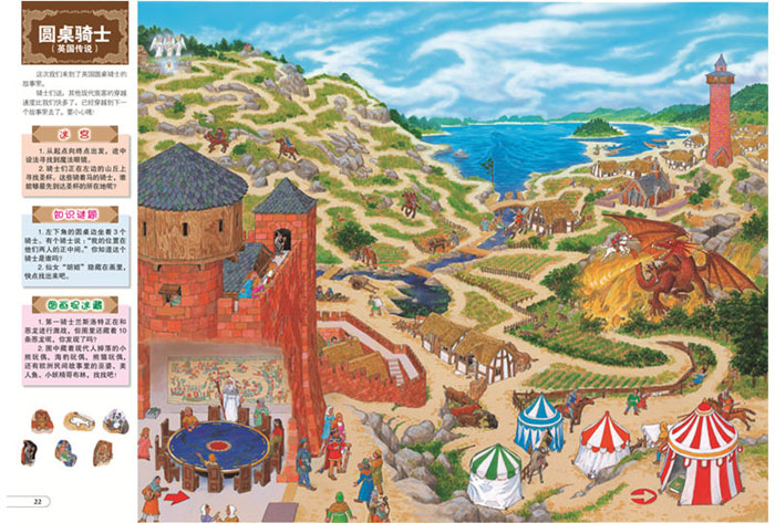1.大型跨页迷宫图,同时配有简洁的场景说明。全书的说明文字连起来就是一个有趣的探险故事,让小读者们跟着迷宫一起捉迷藏。