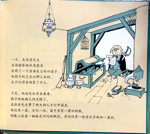 一天,麦洛普先生在阁楼昏暗的角落里 发现了一只落满灰尘的旧箱子。他想不起它是从哪儿来的,也不记得里面装了什么。 于是,他决定打开来看看。箱子的铰链已经生锈了, 麦洛普先生费了好大劲儿才打开箱盖。 他往里一看,大吃一惊,箱子里有一摞旧制服, 制服上放着一柄银光闪闪的佩剑,旁边还有一把老式手枪和一叠纸。