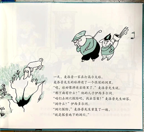 一天,麦洛普一家在打高尔夫球 麦洛普先生的球掉进了一个很深的洞里 “嗯,球好像掉进岩缝里了。”麦洛普先生说。“那下面有什么?”他的儿子伊西多尔问。 “咱们去洞穴探险吧,找出答案!”麦洛普先生回答“洞什么?”伊西多尔问。 “洞穴探险,”麦洛普先生重复了一遍,“就是探索地下的洞穴。”
