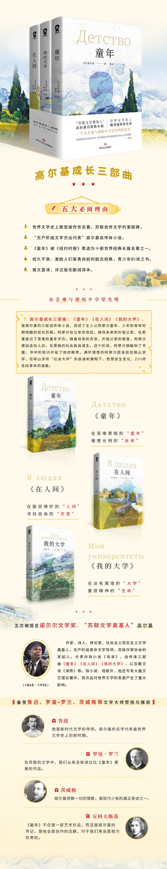 高尔基成长三部曲,指的是《童年》《在人间》《我的大学》。《童年》是高尔基成长三部曲之一。阿廖沙三岁失去父亲,被带到外祖父家,过起寄居生活。由于家业不景气,外祖父变得专横暴躁。在这样污浊的环境里,还有另外一种人——乐观、纯朴的小茨冈,正直的老工人格里戈里,善良公正的外祖母。但生活并没有因此而好转,因为贫疾交加,阿廖沙在学校受到歧视和刁难,只能和别的孩子合伙拣破烂。而这时母亲又去世了,埋葬母亲后,阿廖沙便到“人间”谋生去了。