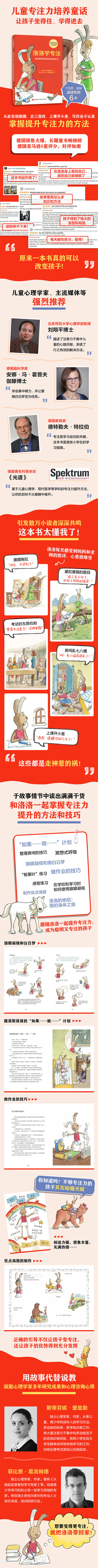 磨磨蹭蹭的早上,做不完的作业,屡屡出错的听写,记错时间的考试,乱糟糟的房间……小兔子洛洛每天都受到妈妈和老师的批评,这些都是走神惹的祸!洛洛知道她应该专心,但是她不知道应该怎么做。在荒芜森林中,她遇到了一只名叫萨金的狼。之后,萨金成了洛洛的导师,教给洛洛提升专注力的方法,洛洛的家人和好朋友们也纷纷教给洛洛各种方法,极大地改善了洛洛的状况。 故事中也展现了洛洛的天赋优势:想象丰富,充满热情,创造力强,对热爱的事情非常投入……正确的引导不仅让洛洛变专注,还会让洛洛的这些优势得到充分发挥。 在这本书里,你将和洛洛一起学习这些提升专注力的方法: •“如果……就……”计划 •“板栗叶”练习 •整理房间的技巧 •感官练习 •做作业的技巧 •洛洛的绝招:狼的身体之旅