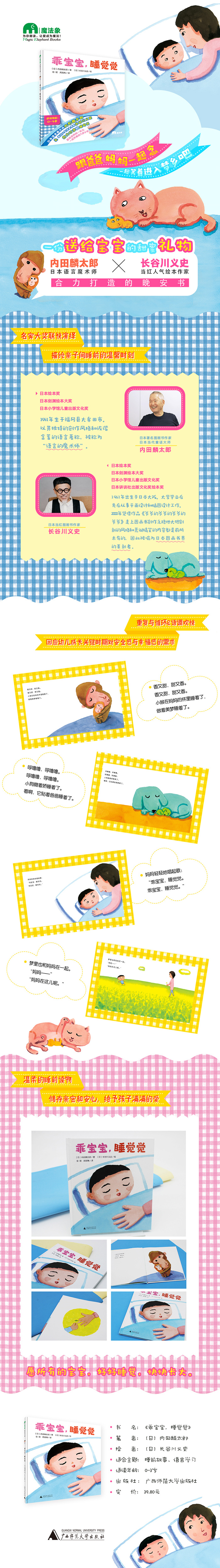 ★日本语言魔术师内田麟太郎&当红人气绘本作家长谷川义史合力打造的晚安书 ★愿所有的宝宝,好好睡觉,快快长大。 ★跟爸爸妈妈一起念,一起笑着进入梦乡吧。 ★温柔充满韵律的文字,明亮鲜艳的图画,一份送给宝宝的甜蜜礼物。