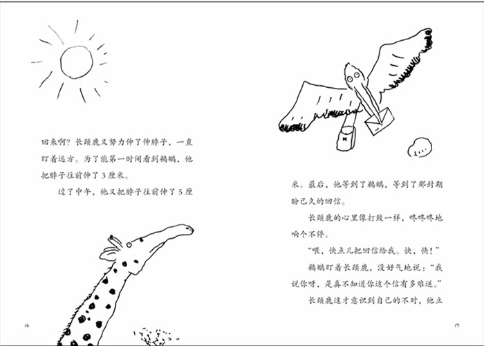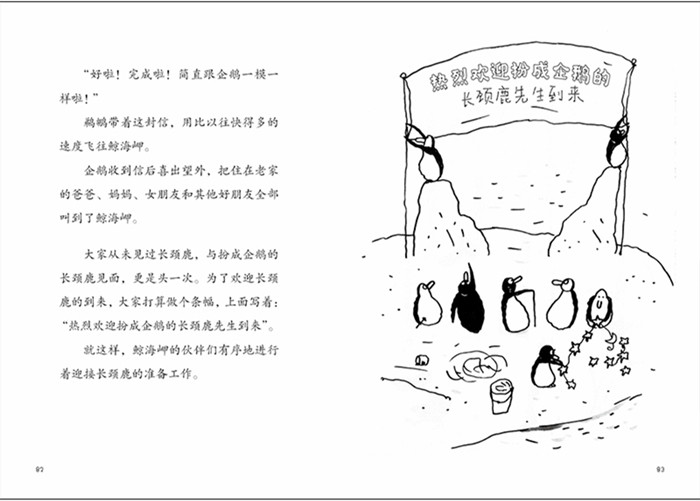 非洲草原上住着一只长颈鹿,他觉得生活很无聊,想知道地平线那边住着谁,通过鹈鹕邮递员,他开始和南极的企鹅通信。通过信件往来,长颈鹿和企鹅对彼此越来越好奇,于是,长颈鹿决定去见一见这位企鹅笔友。终长颈鹿与企鹅在鲸海岬相会,并结识了鲸海岬的朋友。长颈鹿终于感受到了生活的乐趣,就连年迈的鲸鱼老师也受到感染,也开始写信寻找笔友了……