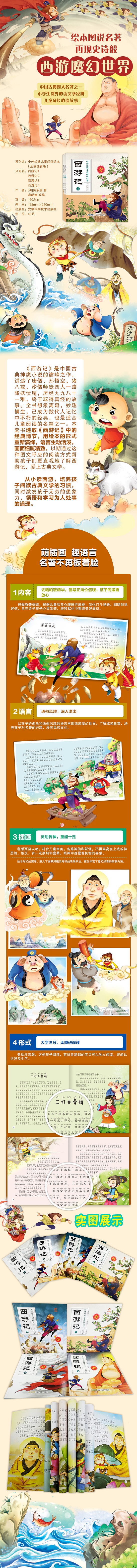 1.内容上,去糟粕取精华,倡导正向价值观,孩子阅读更放心。把握原著精髓,根据儿童欣赏心理进行编排,淡化打斗场景、剔除封建迷信,旨在给予孩子心灵滋养,潜移默化中塑造美好品格。 2.语言上,以孩子的视角和通俗风趣的语言再现西游魔幻世界,了解取经故事,培养孩子对名著的兴趣,浸润民族文化。 3.插画灵动传神,童趣十足,萌版西游人物,符合儿童审美。各路神仙和妖怪,不再高高在上或凶神恶煞,相反,有一点亲切和蠢萌,眼神中透露着机智的喜感。 4.绘本形式的演绎,融入了幽默风趣及夸张的表现手法,更加丰富了魔幻好看的故事内涵。 5.大字注音,无障碍阅读。美绘注音版,方便孩子阅读,有拼音基础的宝贝可以独立阅读,还能认识好多生字。 6.从小读名著,培养孩子阅读古典文学的习惯,同时激发孩子无穷的想象力,领悟和学习为人处事的道理。