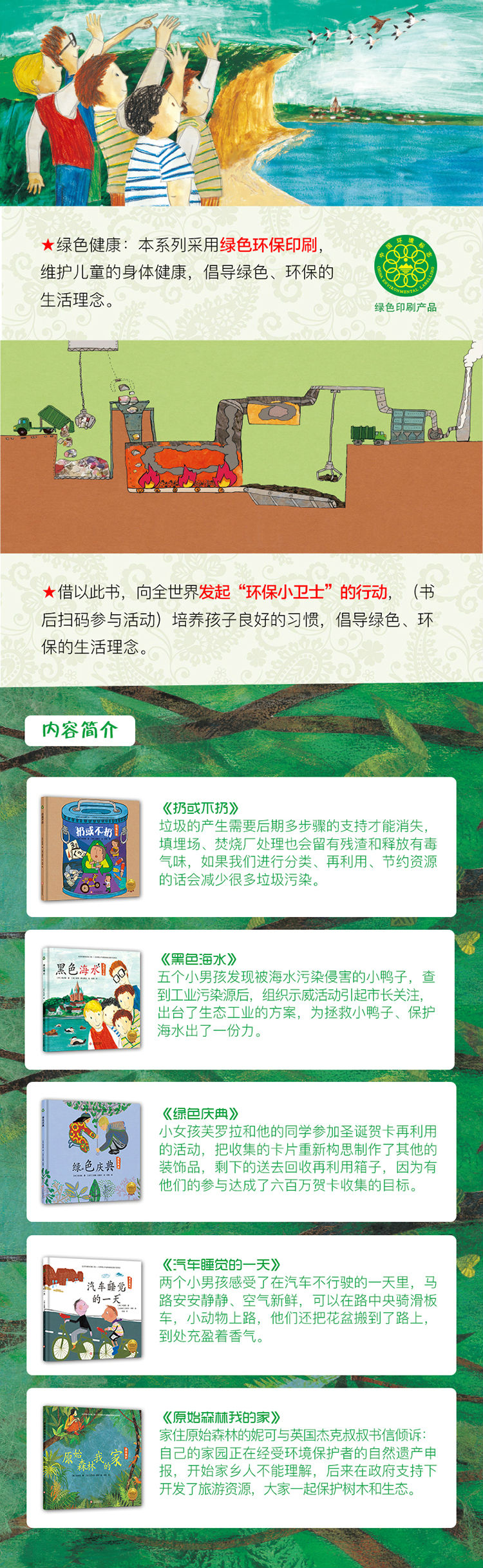 今天的儿童便是明天城市里的创造者、人类的传承者,对于孩子我们应把握好理念引导,督促行为习惯养成,本套环保绘本从汽车垃圾乱堆、尾气排放、工业污染、烧荒砍伐、纸张浪费五大方面现状来提倡垃圾分类、绿色出行、生态工业、森林保护、纸张再用。是国内*一套系统培养儿童环保意识的绘本。