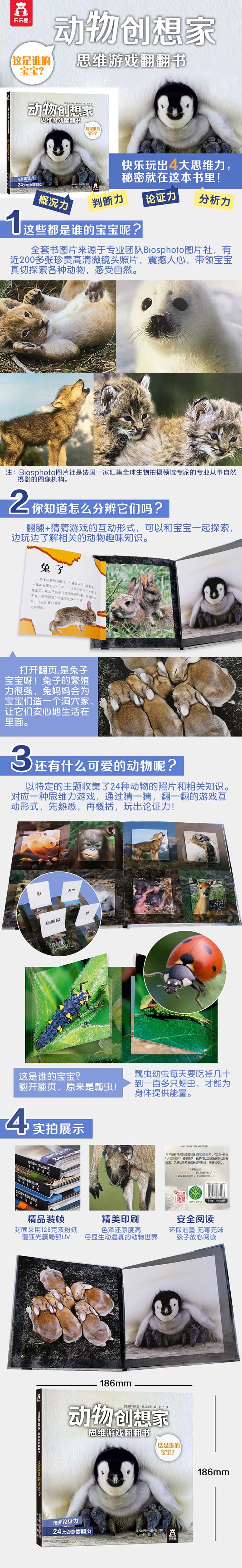 《动物创想家 思维游戏翻翻书》系列共4册,分别是《这是谁的宝宝?》《这是谁的巢穴?》《这是谁的屁股?》《这是谁的脚?》。每册都以特定的主题收集了24种动物的照片和相关知识。这既是一套动物百科童书,更是锻炼孩子思维力的趣味游戏书。书中每页都有一个翻翻页,翻开前,是一种动物身体局部的超近距离放大照片,家长可以让孩子根据局部的图像,鼓励孩子通过论证、分析、概括、判断的思维过程,猜猜翻页里面的动物是谁。在这样的游戏过程中,让孩子的阅读过程充满乐趣,也让孩子的大脑得到了充分锻炼。《这是谁的宝宝?》:通过翻翻页的有趣形式为小朋友展示了24种动物的幼崽及相关的知识。什么宝宝一出生就躲在妈妈的育儿袋里?什么宝宝每天至少要吃掉几十只蚜虫?什么宝宝和爸爸妈妈长得很不一样?什么宝宝在冰天雪地中被爸爸妈妈保护着?……快翻开翻页寻找答案吧!书中精美的插图全部为真实的照片,24种动物”亲子教育家”带领宝宝边玩边探索它们的宝宝们,论证动物成长的可能性。
