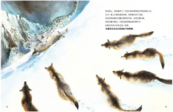 一对雪豹幼仔准备独立,他们将在这一年里从他们的母亲那里学习所有的生活技能。 故事就从他们出生后讲起,这对雪豹兄妹从他们细心的母亲那里了解这个世界,尤其是关于捕猎。从一开始,他们就学会了妈妈教给他们的规则:这是一个危险的世界。只要顺着猎物留下来的气味,悄悄地并快速追踪猎物,保护你的猎物,在风暴中找到避难所,远离人类。猎物的血迹既不温情,也没法消失。整个故事中贯穿着关于雪豹的相关知识。栩栩如生的插图恰到好处地帮我们认识了一些不常见的动物:比如捻角山羊、野山羊和鼠兔。本书描述了发生在巴基斯坦的兴都库什山脉中一切。全书巧妙地运用了水彩的蓝色和白色。书中所示的动物很少见在休息,他们总是在锻炼身体,学习他们所需要独立生活的技能。桑德拉将动物拟人化,告诉我们的小朋友,独立成长的道路都是相通的,无论是动物还是人类。 人类的幼子应该像这些雪豹一样,学会翻滚,学会跳跃,学会成长,从他们身上,我们人类所要学的东西还很多。