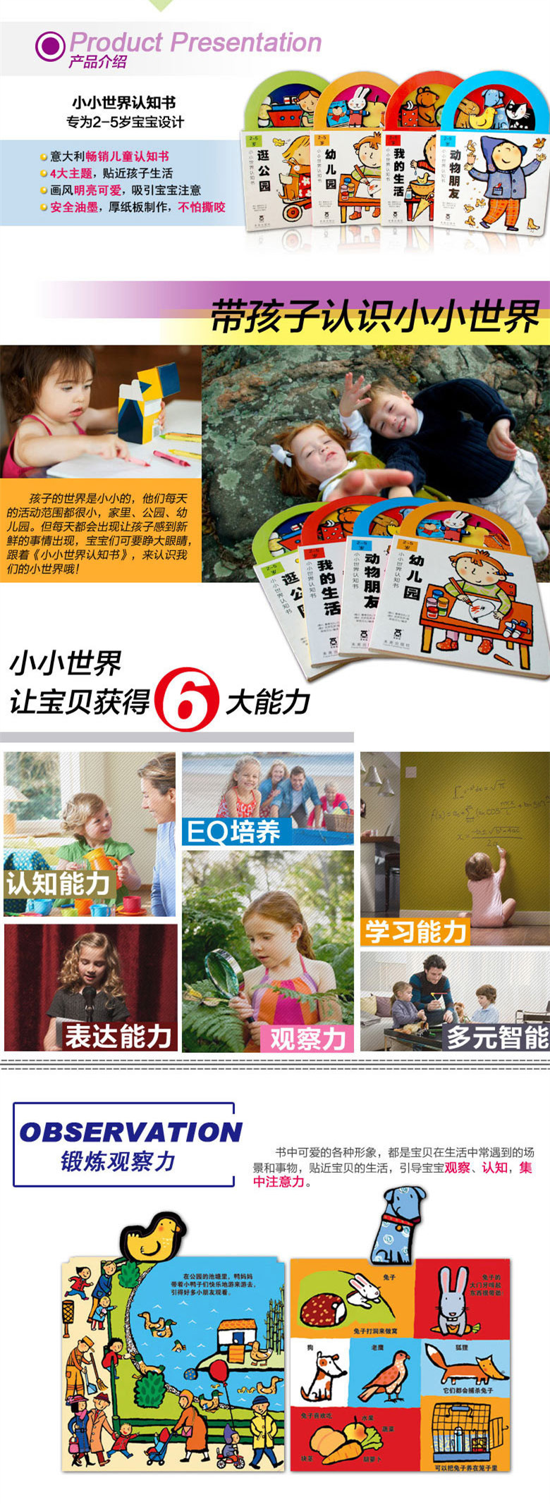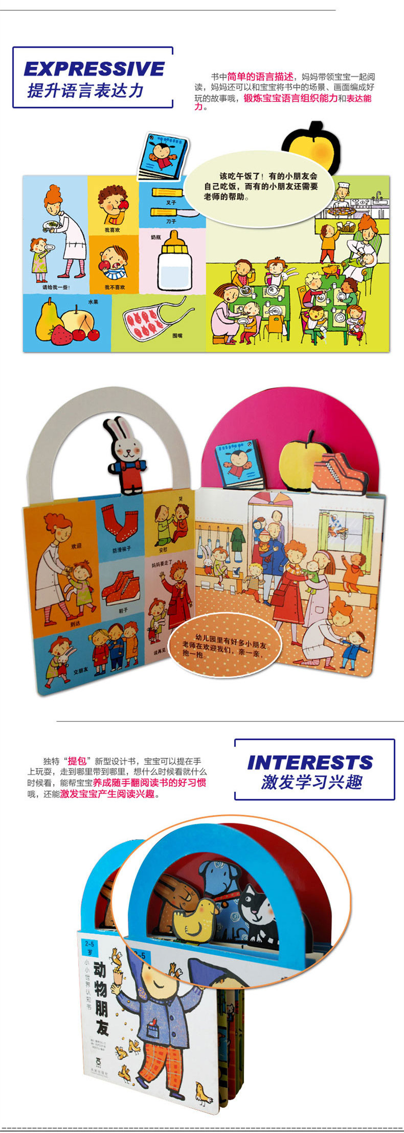 这套引自意大利LA COCCINELLA的可爱“提包书”中的内容设计采用国外的育儿理念—可以并且引导宝宝去观察,激励宝宝去发现的互动阅读形式。帮助妈妈们为即将入园的小宝宝生动的讲述关于幼儿园里会发生的一切,培养宝宝基本的逻辑思维能力和语言表达能力。让孩子不仅仅可以获得对事物的认知,更多的是让能够孩子感受到学习过程的乐趣,同时培养孩子良好的学习习惯。