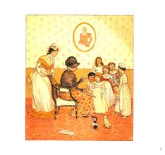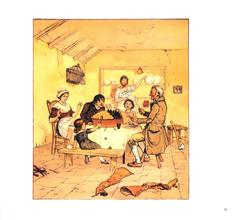 伦道夫·凯迪克的许多作品都是以古老经典的童谣为故事底本进行创作的。他的插画精美、细致,有极高的艺术造诣。《唱一首六便士之歌》《胖宝宝》即是如此。《唱一首六便士之歌》原本是一首带有暴力与黑暗色彩的童谣,但凯迪克深谙给孩子讲故事的技巧,他精心加工文字,绘制可爱的插画,有力驱散了童谣中原有的恐怖与阴霾,让小读者在阅读中感受到安全和快乐。故事的第一幅图画是讲故事的老奶奶和一群听故事的小孩子,这让小读者不由得身置其中,亲切万分。随着雪地捕鸟等熟悉的生活场景的出现,引发起了小读者的情感共鸣。而儿童化的主人翁形象——数钱币的国王、吃面包的王后,更是将整个故事转化成了一个好玩的“过家家”游戏。在《胖宝宝》里,刚开始那个调皮吵闹的胖宝宝似乎并不怎么招人喜欢,但当细心的爸爸将兔皮裹住宝宝、妈妈牵着宝宝去草坡上玩耍等场景出现时,父母对孩子那种无条件的爱、宽容与接纳,立刻令人备感温暖。也许正是因为这种风趣幽默,这种亲切温暖,才让凯迪克的作品经久不衰。