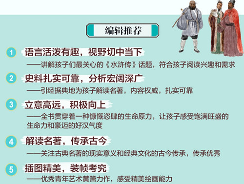1.语言活泼有趣,视野切中当下——讲解孩子们*关心的《水浒传》话题,符合孩子阅读兴趣和需求,比如《水浒传》里梁山好汉为什么要聚义,为什么都会武功,等等,拉近了孩子与《水浒传》的距离 2.史料扎实可靠,分析宏阔深广——引经据典地为孩子解读《水浒传》的成书背景、人物特色、主要情节等,帮助孩子读懂《水浒传》和《水浒传》背后的内容,全面感悟名著的持久魅力 3.立意高远,积极向上——全书贯穿着一种慷慨恣肆的生命原力,让孩子在阅读《水浒传》时感受到饱满旺盛的生命力和豪迈的好汉气度,涵养一股昂扬向上的精神内涵 4.解读名著,传承古今——作品定位为“解读”,终极目标是关注名著阅读的现实意义和经典文化的古今传承,在解读中让经典的价值持续传承下去 5.插图精美,装帧考究——优秀青年艺术黄箫力作,古香古色,原汁原味,感受中华绘画的绝美震撼