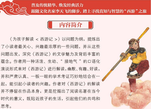 《为孩子解读<西游记>》以问题为纲,提炼出了小读者非常关心、兴趣非常浓厚的一些问题,并从这些问题出发,深究《西游记》的文学魅力及背后丰富的蕴含。作者用一种活泼、生动、“接地气”的口语化演说形式来对《西游记》进行解读,幽默、有趣、好读,并和严肃认真、一板一眼的学术考证巧妙地结合在一起,能引起小读者的兴趣。 作者对《西游记》的解读并不停留在作品本身,更是挖掘出了阅读名著在当今时代的意义,既贴近孩子的生活,引起他们的共鸣和思考,还能让他们在“润物细无声”的氛围中体会到了中国传统文化的持久魅力。这也是我们鼓励孩子阅读经典名著的目的。