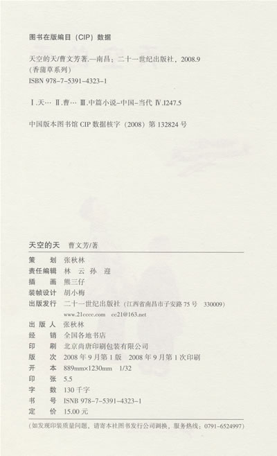 《天空的天》是女作家曹文芳“香蒲草”系列(21世纪出版社出版)中的一本,该系列由《香蒲草》、《丫丫的村庄》、《栀子花香》、《天空的天》四本组成。尽管四本书的主人公各不相同,背景却始终是作者熟悉的苏北某个小村庄。在这些童年梦境中,读者朋友们能嗅到香蒲草的芳香,看到凤仙花的火红,体味寂寞冷清的村庄和碧蓝高远的天空。