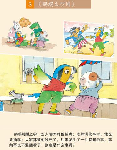 《鹦鹉太吵闹》:鹦鹉*天上学,别人说话时喜欢插嘴,老师讲故事的时候,讲话讲个不停,直到他一口吞下大象带来的糖,糊住了嘴巴,说不了话,他才知道插话很惹人烦,鹦鹉*终学会了正确的交流方式。