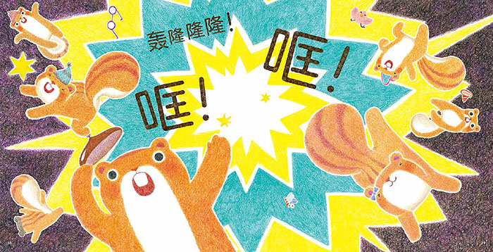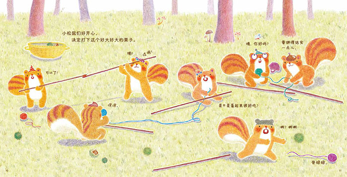 秋天到了,毛毛的栗子成熟了。 7 只小松鼠开开心心地去打栗子。 在树林里,他们发现了一个好大好大的栗子。 哎呀,麻烦了!那个栗子长得实在是太高了。 小松鼠们该怎样才能打下它呢?