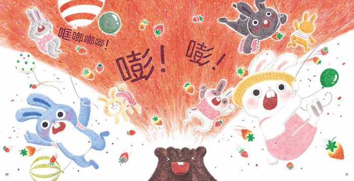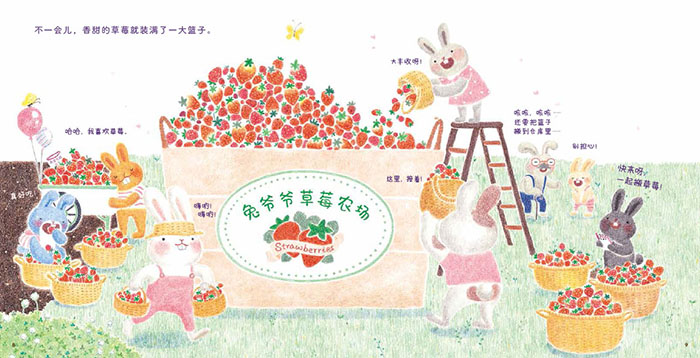 春天到了,暖洋洋的风轻轻地吹着。 7 只小兔子去帮生病的兔爷爷摘草莓。 不一会儿,他们就摘了满满一大篮子草莓。 哎呀,坏了!一阵大风把草莓全都吹进了火山口。 小兔子们这下可怎么办呢?