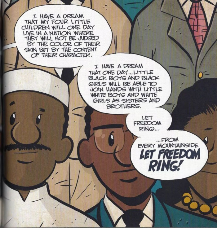 马丁·路德·金小时候就对非洲裔美国人受到的可怕和不公平待遇感到震惊。当他长大后,他决定用有力的言辞和平地解决这个问题。他帮助人们聚集在一起进行非暴力的抗议和游行,他总是宣扬友爱他人,并勇敢地为美国走向种族平等而奋斗。