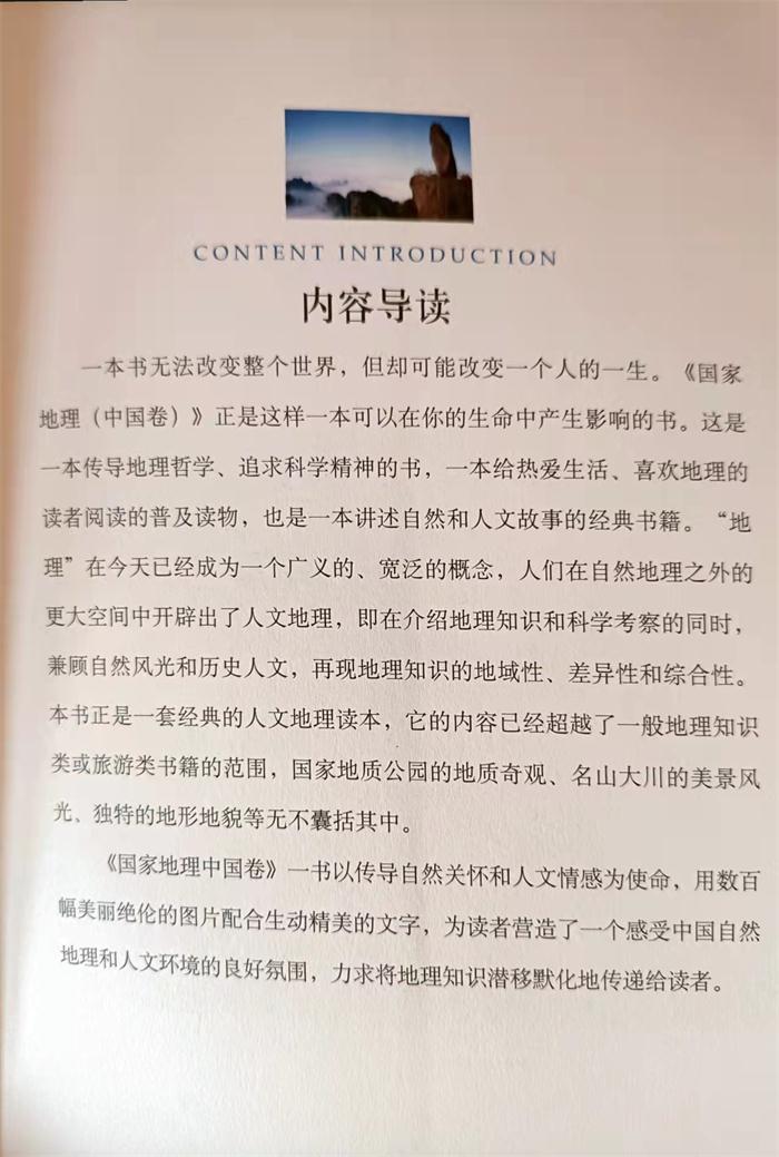 《国家地理中国卷》的内容已经超越了一般地理知识类或旅游类书籍的范围,国家地质公园的地质奇观、名山大川的美景风光、独特的地形地貌、古老的历史文化遗存、中国各地区的民俗民情等无不囊括其中。“地理”在今天已经成为一个广义的、宽泛的概念,人们在自然地理之外的更大空间中开辟出了人文地理,即在介绍地理知识和科学考察的同时,兼顾自然风光和历史人文,再现地理知识的地域性、差异性和综合性。让我们翻开《中国国家地理》,一起去体验惊心动魄的地理探险。