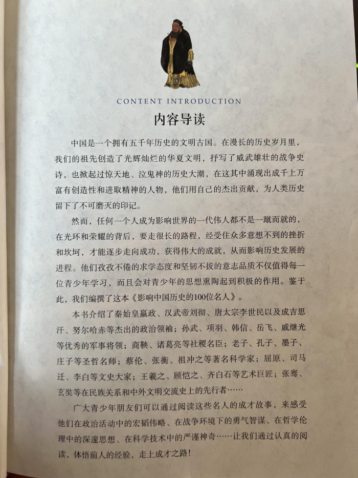 这本《影响中国历史的的100位名人》介绍了秦始皇嬴政、唐太宗李世民等杰出的政治领袖,孙武、韩信、岳飞等优秀的军事将领,商鞅、诸葛亮等社稷名臣,老子、孔子、庄子等圣哲名师,蔡伦、张衡、祖冲之等著名科学家,屈原、司马迁、李白等文史大家……读者可以通过阅读这些名人的成才故事,来感受他们在政治活动中的雄韬伟略、在战争环境下的勇气智谋、在哲学伦理中的深邃思想、在科学技术中的严谨神奇。
