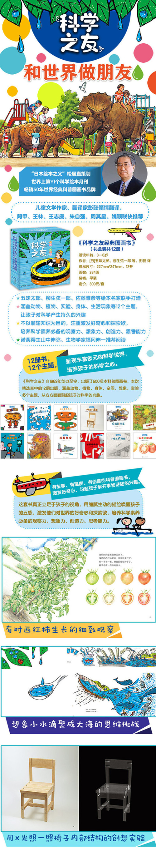 “科学之友”在科学主题和内容覆盖上非常全面。这套书拥有超强的创作阵容,吸引了包括五味太郎、佐藤雅彦在内的、一大批日本知名作家、画家、科学家、教育家共同参与,为孩子们悉心打造出一个个富有情趣的、细腻生动的好故事。 “科学之友”巧妙结合了科学性、人文性和艺术性,帮助幼儿开启探究外部世界和认识内部世界的眼睛,同时也为孩子们插上一对想象的翅膀,在科学与幻想间自由驰骋,在文学和艺术中尽情欢愉。值得亲子共读,也适合在幼儿园和学校科学活动中广泛运用。