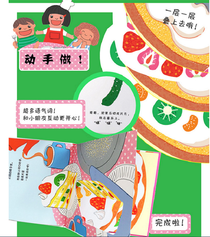 这是一本关于制作与分享的绘本。绘本一开始介绍了各种制作草莓蛋糕的工具和食材——蛋糕片、奶油、水果、打蛋器、铲子……随后按步骤介绍了每一层蛋糕的制作以及食材摆放的顺序。每一页的正面是蛋糕的制作说明,反面是已经做好的蛋糕图,通过裁切将每一层蛋糕的形状展现,在翻页以后会发现整本书也随之叠出了一层层可口诱人的蛋糕。当蛋糕制作完成以后,一群小伙伴就聚在一起开始分享自己制作出来的美食啦!这不仅是一个制作的过程,更是一个分享的过程!绘本通过做蛋糕的故事传递给读者一种独立动手、共同协作的精神。