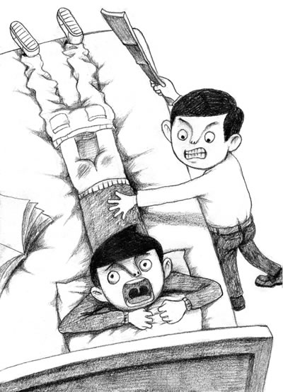 我爸爸也一样,也是这两条儿。可是每次我的哥们儿“叽里呱啦”议论起这个,我都不吭声儿。一来我不愿意说我爸的坏话,二来我也不想让哥们儿知道我常挨揍。再者说,讲了又有什么用?你发一通牢骚,回头他就不揍你了?