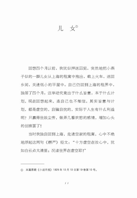 我最欢喜郑德菱。她同我站在地上一样高,走路也一样快,心情志趣都完全投合。宝姊姊或郑德菱的哥哥,有些不近情的态度,我看他们不懂。大概是他们身体长大,稍近于大人,所以心情也稍象大人的无理了。宝姊姊常常要说我“痴”。我对爸爸说,要天不下雨,好让郑德菱出来,宝姊姊就用指点着我,说:“瞻瞻痴!”怎么叫“痴”?你每天不来同我玩耍,挟了书包到学校里去,难道不是“痴”么?爸爸整天坐在桌子前,在文章格子上一格一格地填字,难道不是“痴”么?天下雨,不能出去玩,不是讨厌的么?我要天不要下雨,正是近情合理的要求。我每天晚快听见你要爸爸开电灯,爸爸给你开了,满房间就明亮;现在我也要爸爸叫天不下雨,爸爸给我做了,晴天岂不也爽快呢?你何以说我“痴”?郑德菱的哥哥虽然没有说我甚么,然而我总讨厌他。我们玩耍的时候,他常常板起脸,来拉郑德菱,说“赤了脚到人家家里,不怕难为情!”又说“吃人家的面包,不怕难为情!”立刻拉了她去。“难为情”是大人们惯说的话,大人们常常不怕厌气,端坐在椅子里,点头,弯腰,说甚么“请,请”,“对不起”,“难为情”一类的无聊的话,他们都有点象大人了!