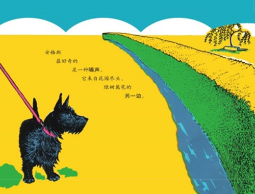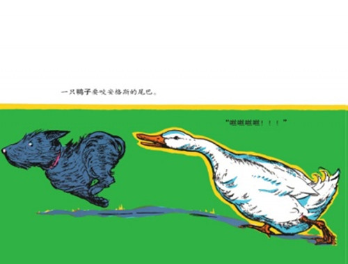 有只小狗,名叫安格斯。他好奇心很强,最想知道绿树篱笆那一边整天“嘎嘎”叫的是谁。 一天,门开了,他趁机跑了出去。他钻过绿树篱笆,发现“罪魁祸首”是两只鸭子。他想吓吓她们,却被追得逃回了家。